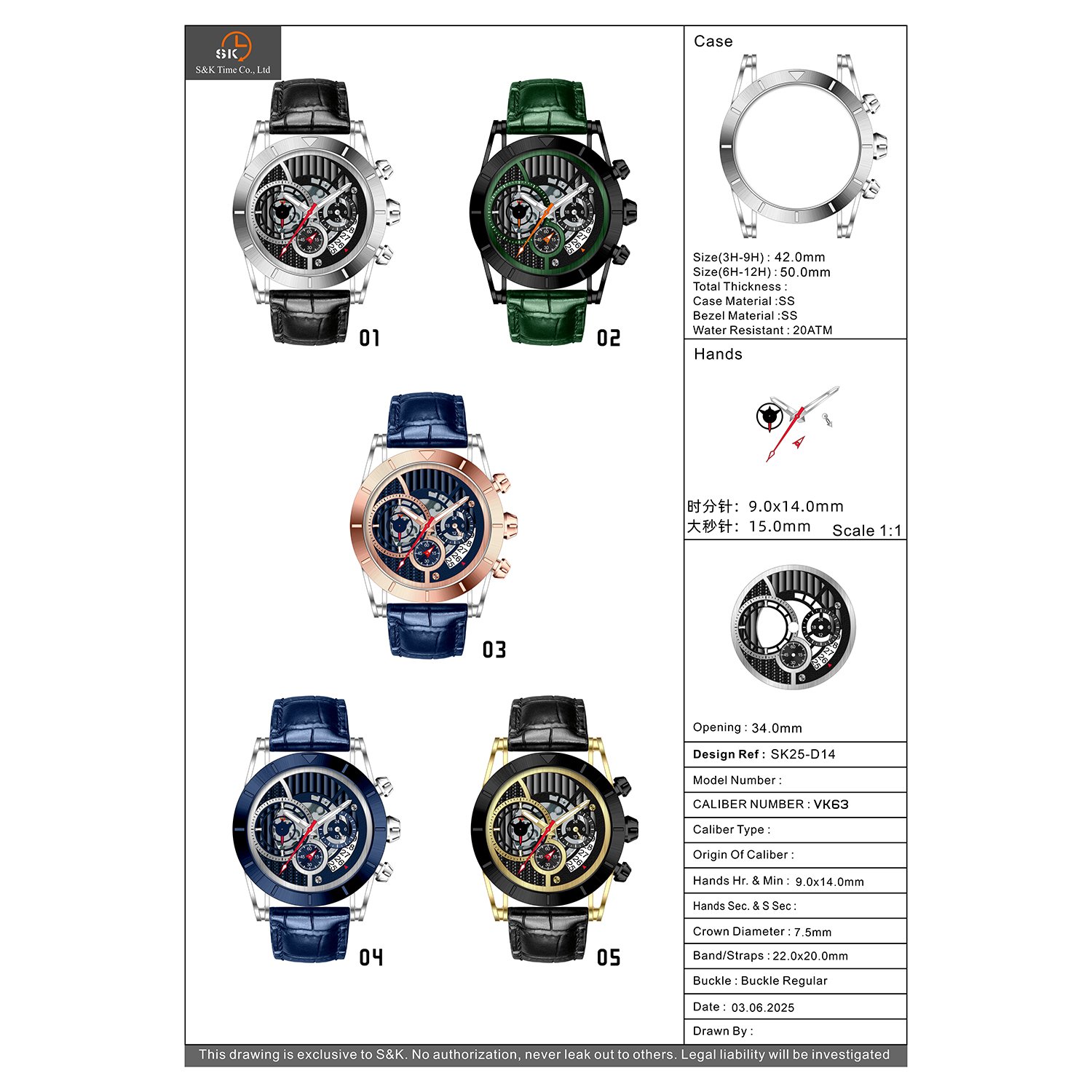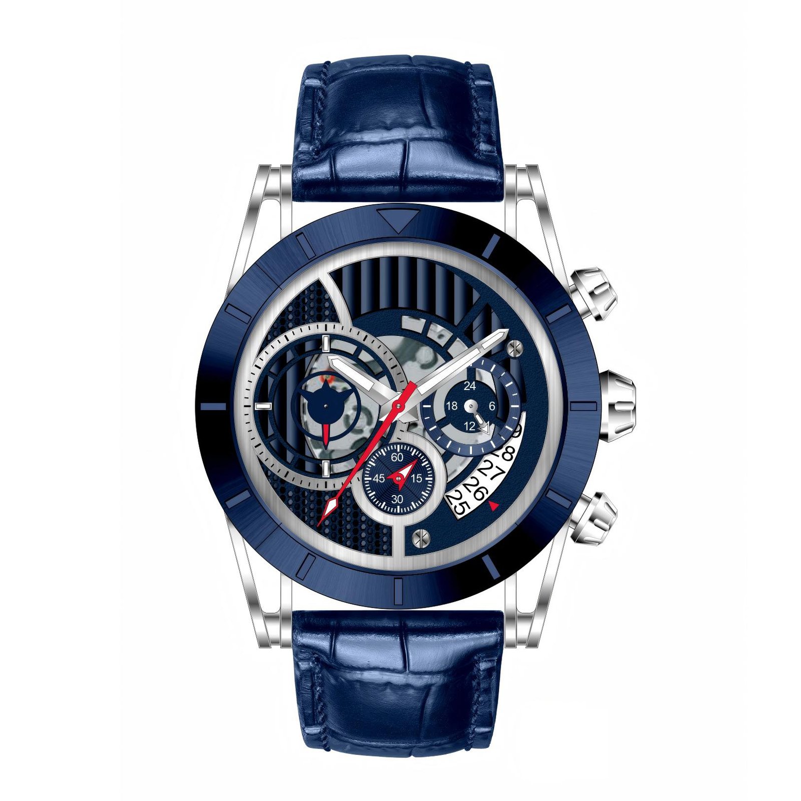 This Leather Watch showcases an unmistakably elegant design featuring bold structural lines. Its round case frames a tactile, ribbed dial that is accented with three skeleton sub-dials, and a clear date wheel for added utility. Completing the look is a refined, genuine leather strap embossed in an alligator pattern to blend classic style with luxurious textures.
