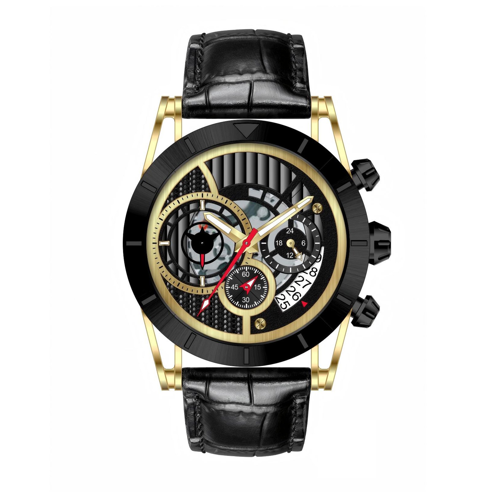 This Leather Watch showcases an unmistakably elegant design featuring bold structural lines. Its round case frames a tactile, ribbed dial that is accented with three skeleton sub-dials, and a clear date wheel for added utility. Completing the look is a refined, genuine leather strap embossed in an alligator pattern to blend classic style with luxurious textures.